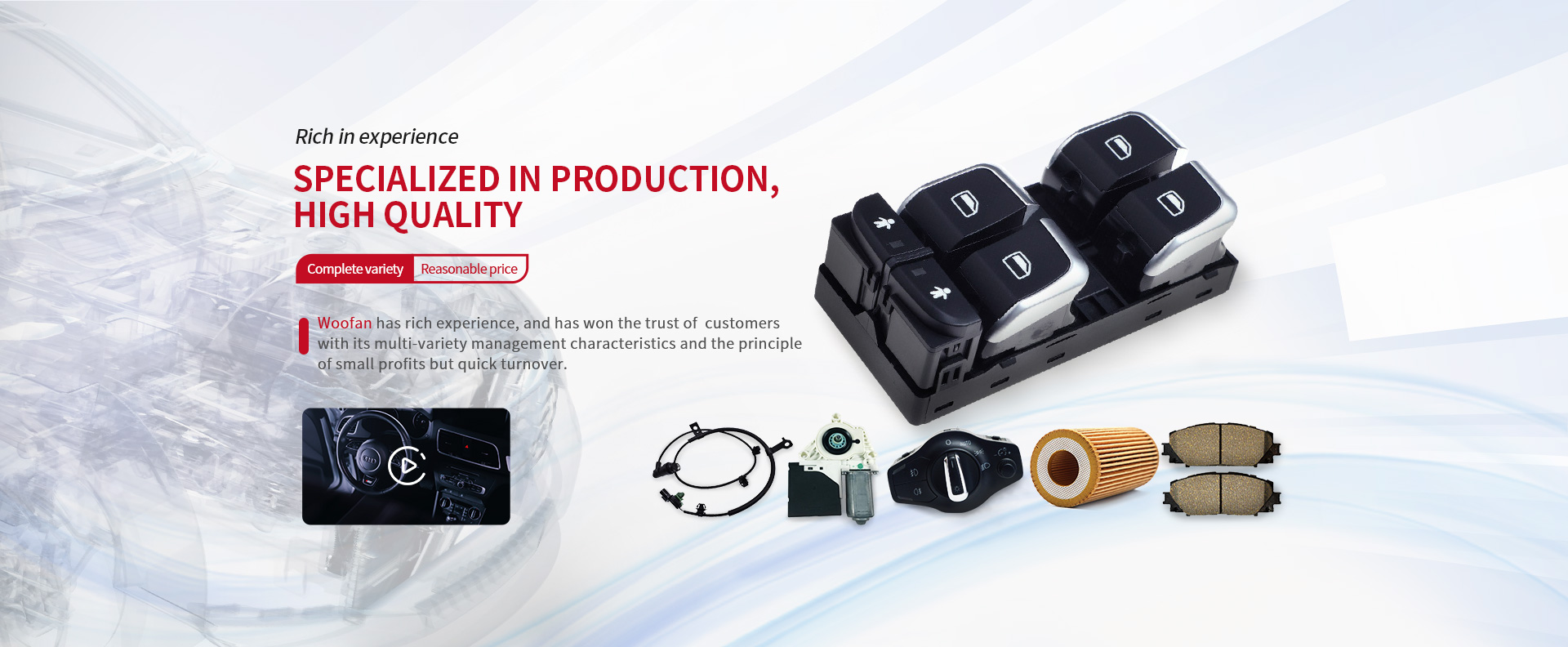 Ruian Woofan Trade Co., Ltd. a professional Auto part and Machinery manufacturing and trading combo which sells window switch, sensor, motor, filter and machinery (including parts) .Our products are areatly appreciated in a variety of different markets throughout the world.
